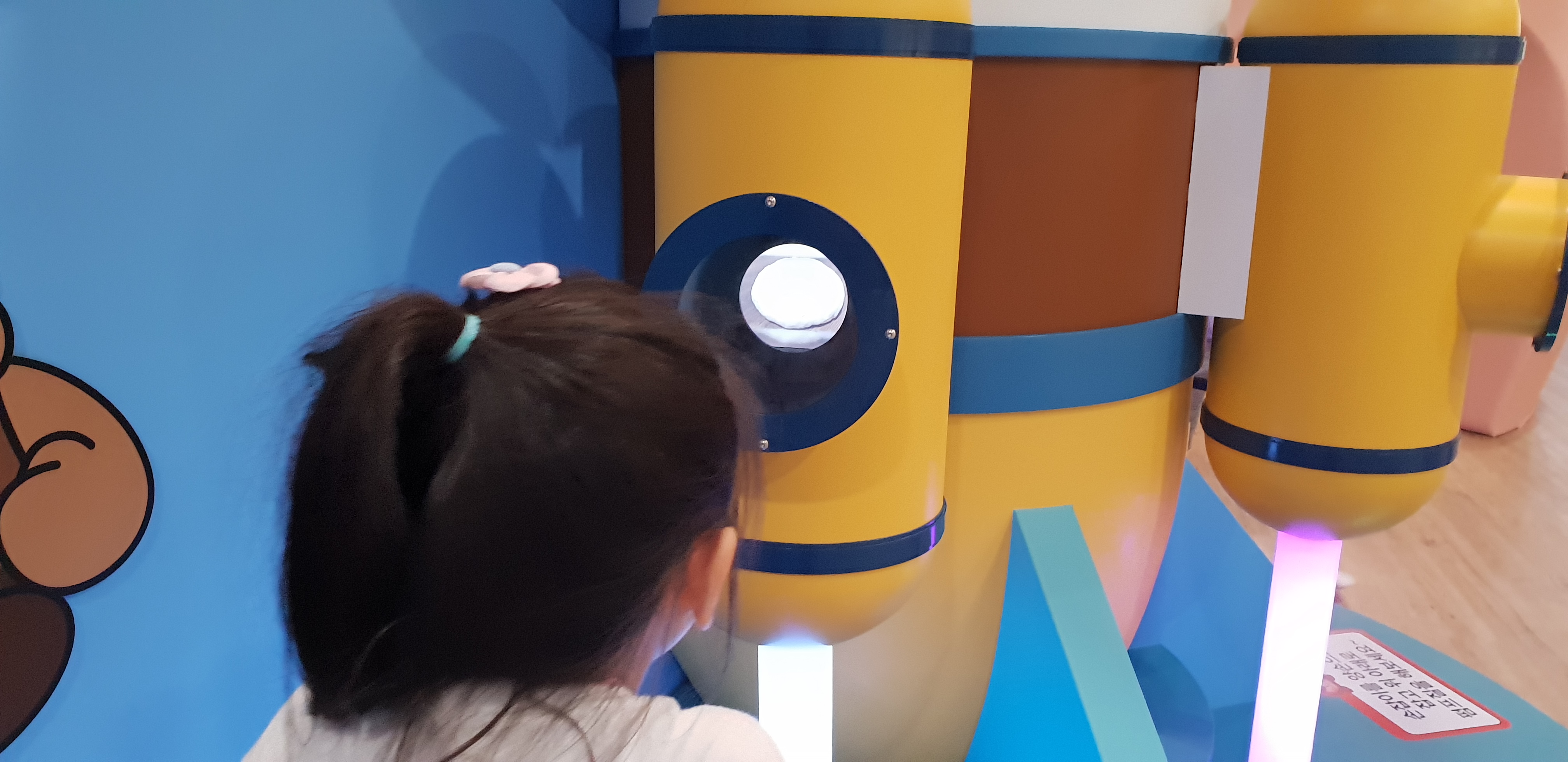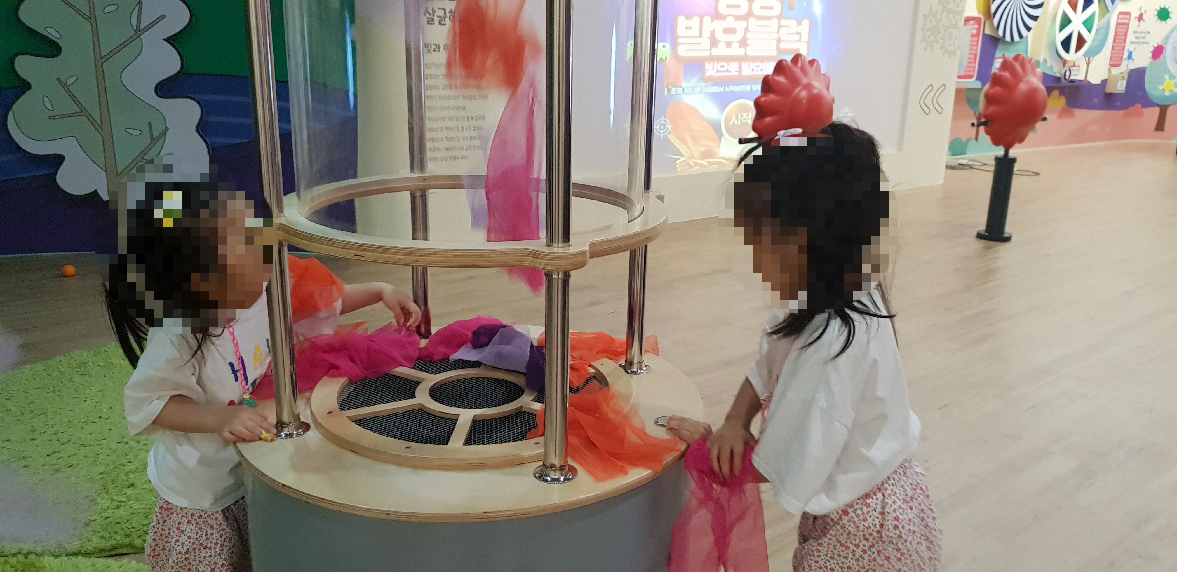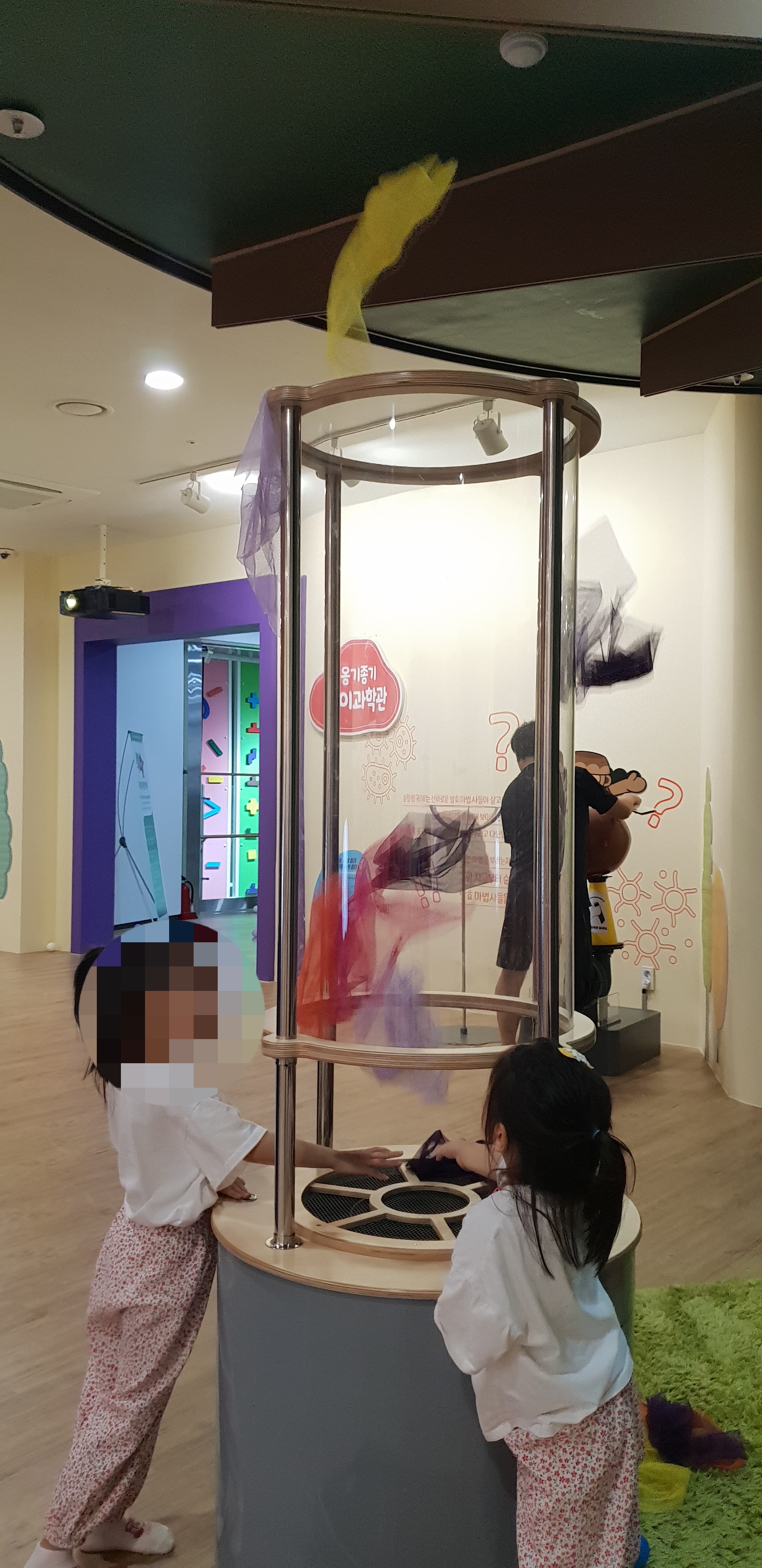 버튼을 누른 채 천을 넣으면 천이 바람 타고 위로 슝슝 날아가는데, 놀이에 진심인 아이들ㅋㅋ