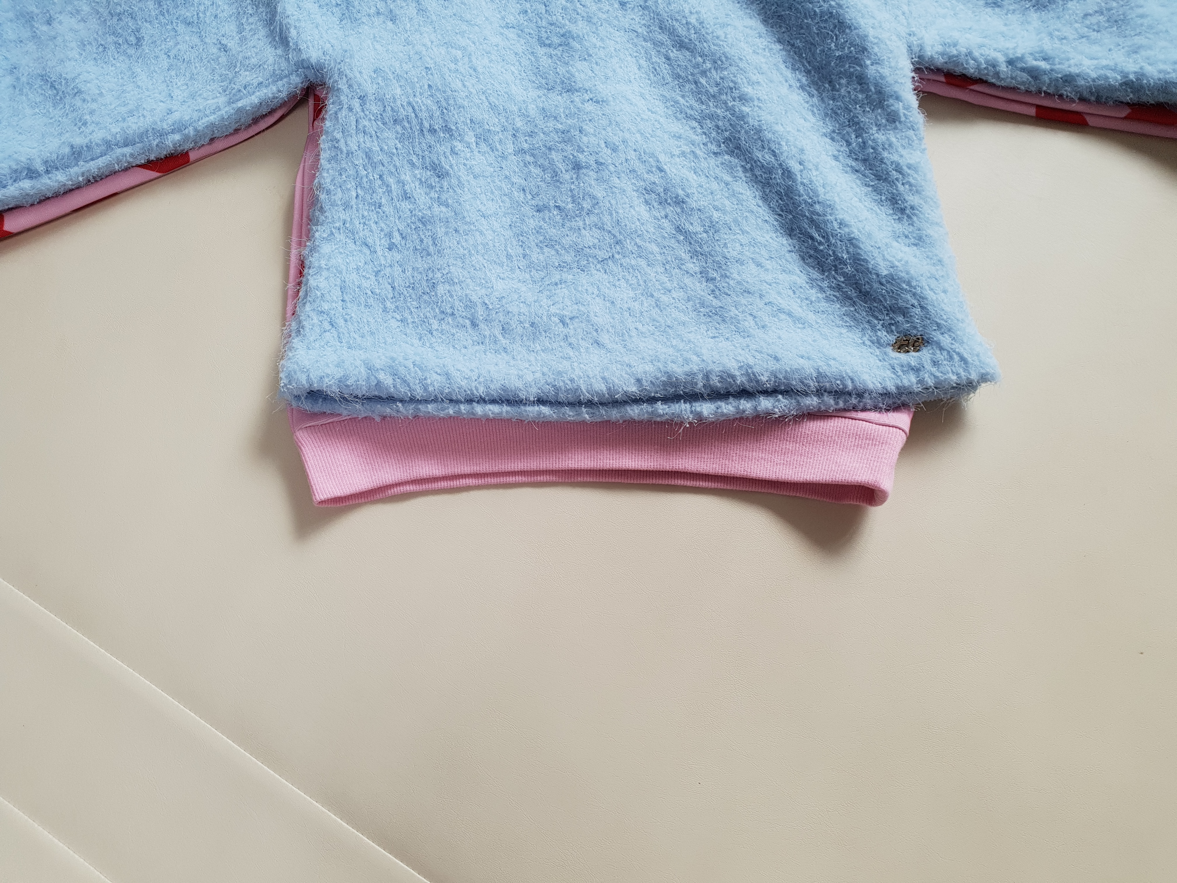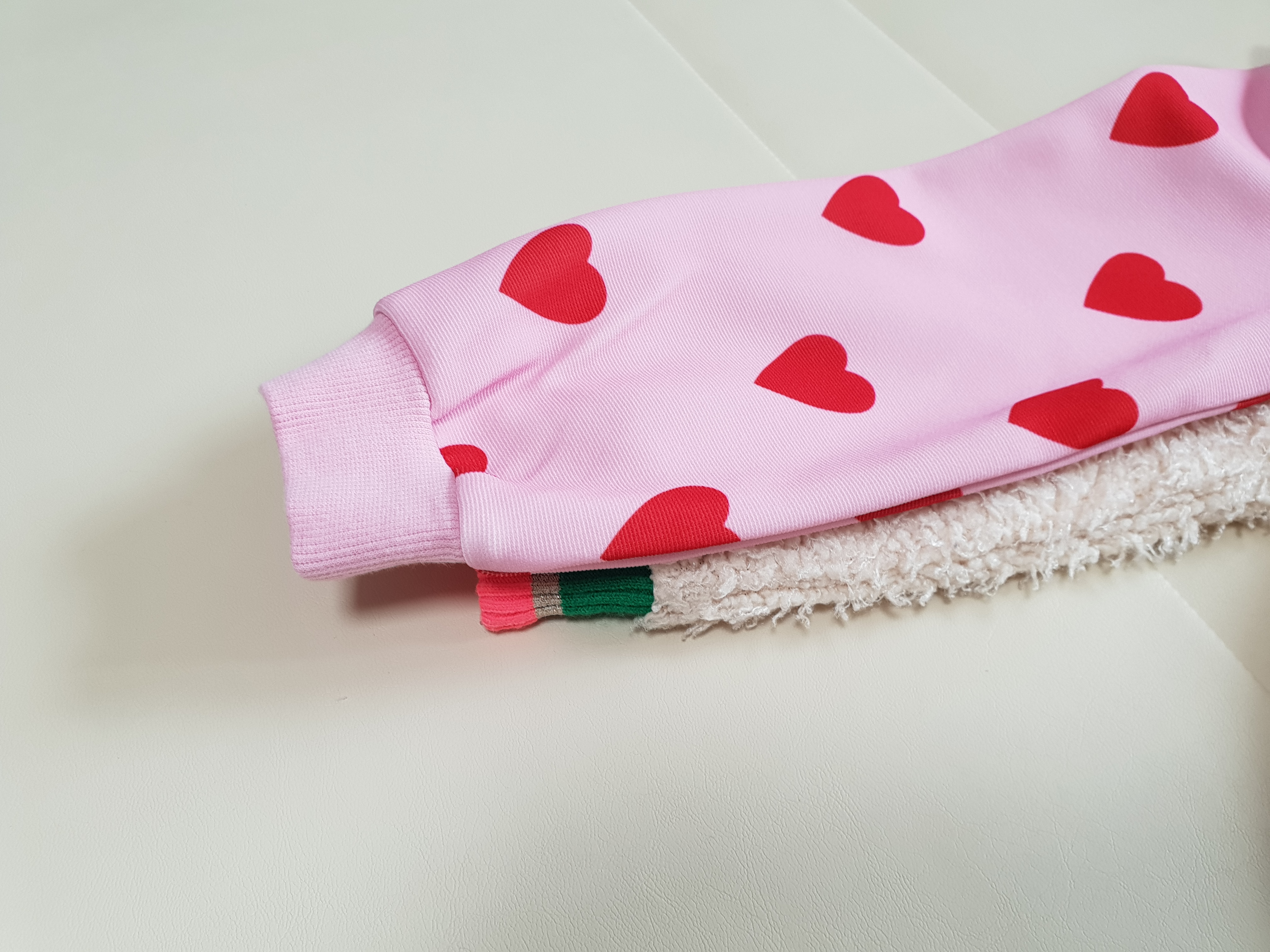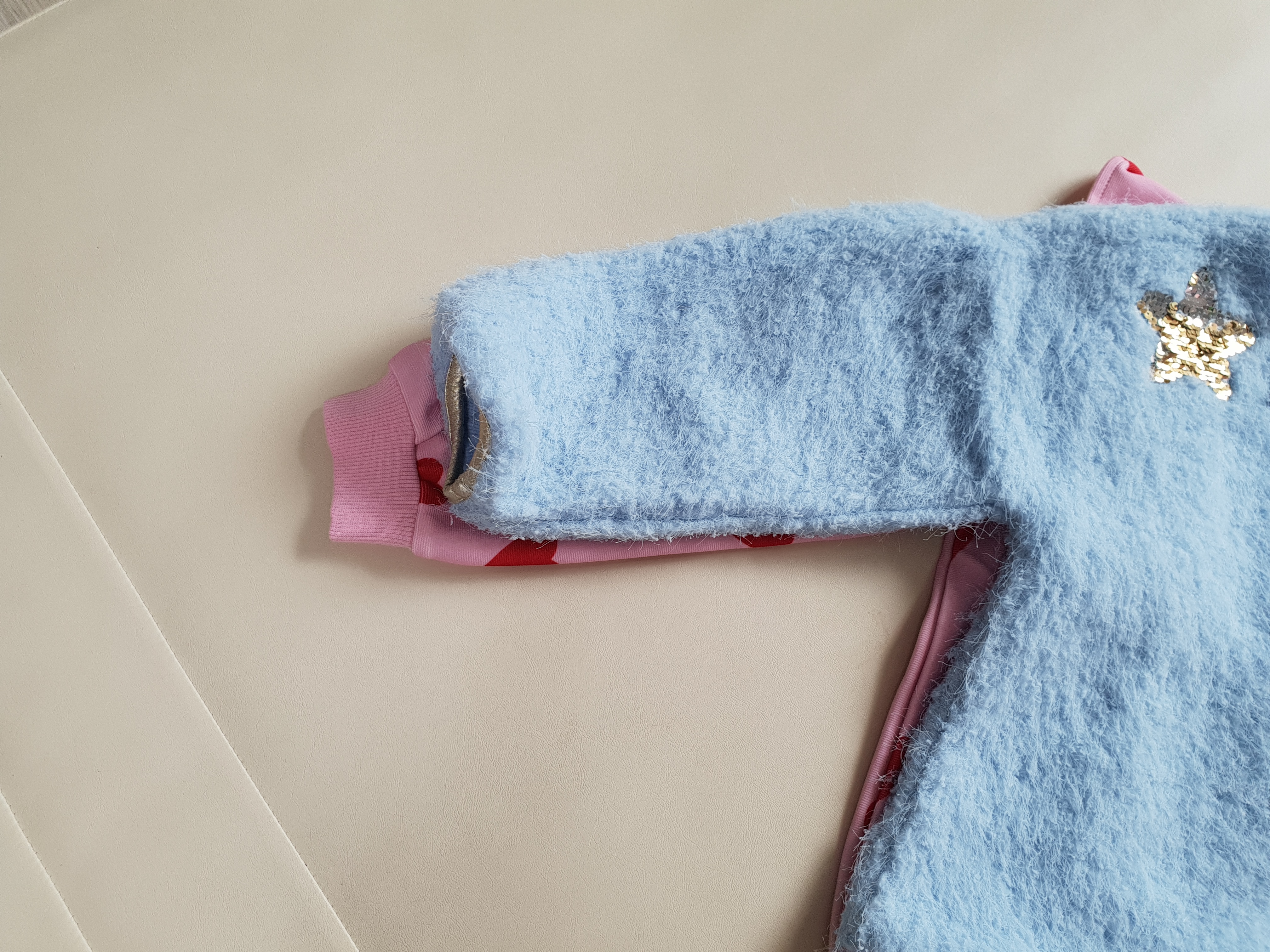 둘 다 프랜치캣 사이즈 130이지만 하트나염 티셔츠가 롱티셔츠에 비해서 소매가 살짝 더 길었다.